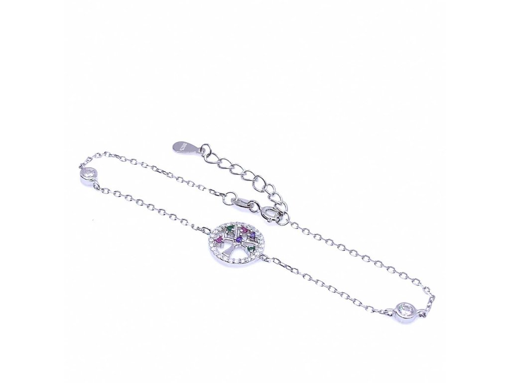 Moderní náramek ze stříbra (925/1000). Přívěsek na náramku má tvar stromu života v kruhu, který je po obvodu osázen bílými zirkony a koruna stromu je osázena různě barevnými . Řetízek je vzoru anker s nastavitelnou délkou a zdoben zirkony . Šperk je chráněn povrchovou úpravou rhodiováním, které jej chrání před oxidací. Všechno naše zboží je označeno puncovními značkami uznanými Puncovním úřadem ČR.Doplňkové parametry