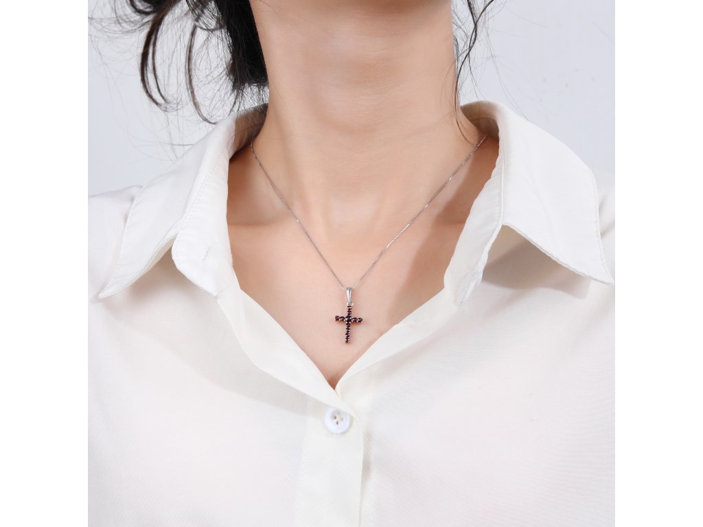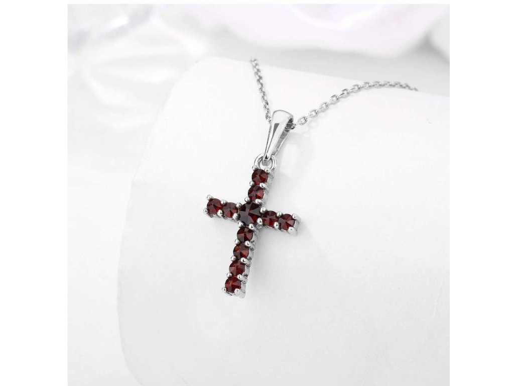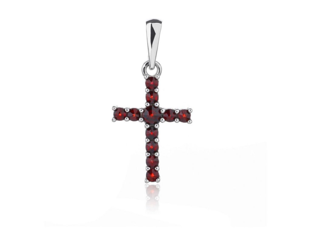 Dámský přívěsek ze stříbra (925/1000). Přívěsek má tvar kříže, který je osázený Českými granáty. Ke šperku obdržíte certifikát o pravosti kamene. Šperk je chráněn povrchovou úpravou rhodiováním, které jej chrání před oxidací. Všechno naše zboží je označeno puncovními značkami uznanými Puncovním úřadem ČR.Doplňkové parametry
