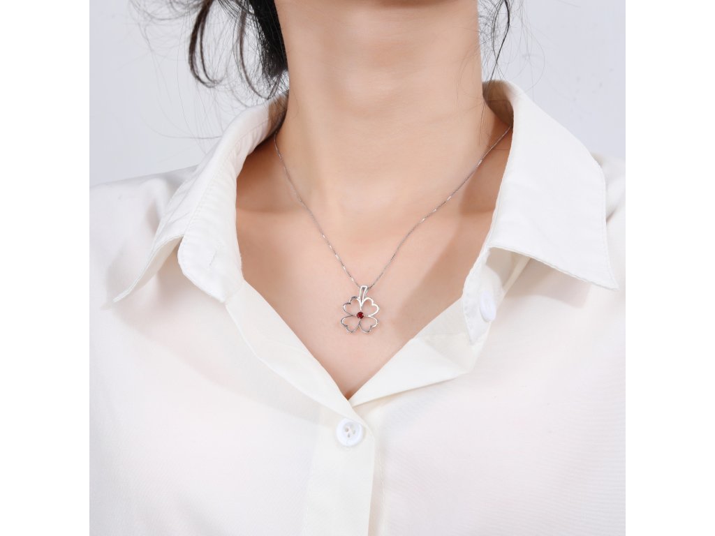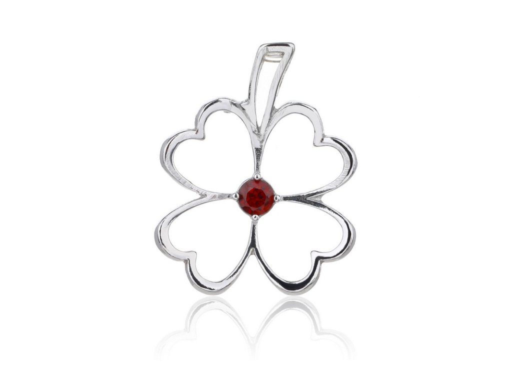 Jemný dámský přívěsek ze stříbra (925/1000) má čtyřlístku, který je v provedení velkého lesku a jeho střed zdobí Český granát. Pravost kamenů je doložena certifikátem o pravosti. Šperk je chráněn povrchovou úpravou rhodiováním, které jej chrání před oxidací. Všechno naše zboží je označeno puncovními značkami uznanými Puncovním úřadem ČR.Doplňkové parametry
