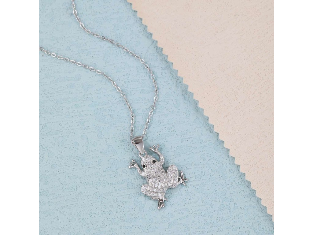 Roztomilý přívěsek ze stříbra (925/1000) ve tvaru žabičky, které bohatě zdobena drobnými bílými zirkony. Šperk je chráněn povrchovou úpravou rhodiováním, které jej chrání před oxidací. Všechno naše zboží je označeno puncovními značkami uznanými Puncovním úřadem ČR.Doplňkové parametry