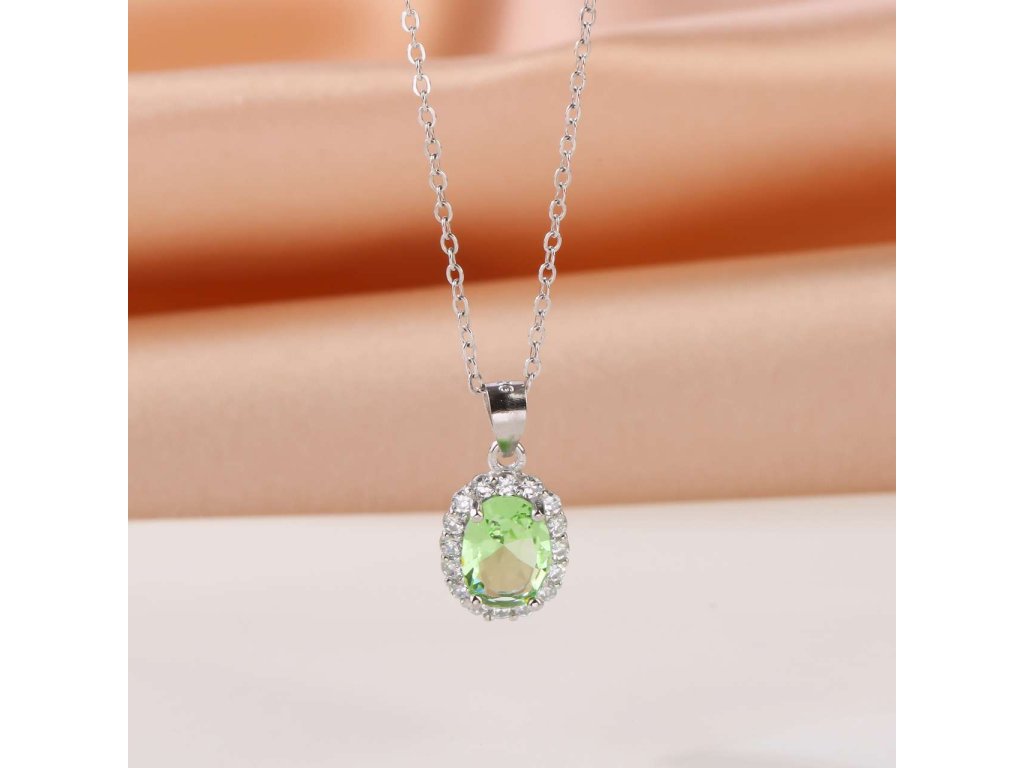 Decentní dámský přívěsek ze stříbra (925/1000) oválného tvaru s velkým centrálním světle zeleným zirkonem, kolem kterého jsou vsazeny drobné bílé zirkony. Stříbro je povrchově upraveno rhodiováním proti oxidaci. Všechno naše zboží je označeno puncovními značkami uznanými Puncovním úřadem ČR.Doplňkové parametry