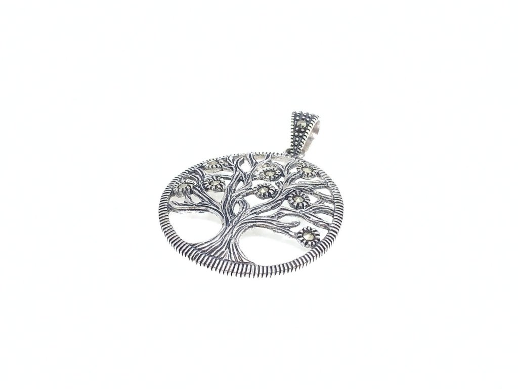 Velmi zajímavý dámský přívěsek ze stříbra (925/1000) kulatého tvaru s motivem stromu života a rámečkem osázeným drobnými markazity,které zdobí též korunu stromu. Stříbro je povrchově upraveno rhodiováním proti oxidaci. Všechno naše zboží je označeno puncovními značkami uznanými Puncovním úřadem ČR.Doplňkové parametry