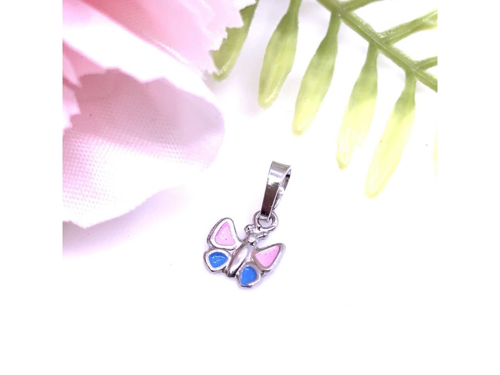 Roztomilý přívěsek ze stříbra (925/1000). Přívěsek má tvar motýlka zdobeného růžovým a modrým emailem. Šperk je chráněn povrchovou úpravou rhodiováním, které jej chrání před oxidací. Všechno naše zboží je značeno puncovními značkami uznanými Puncovním úřadem ČR.Doplňkové parametry