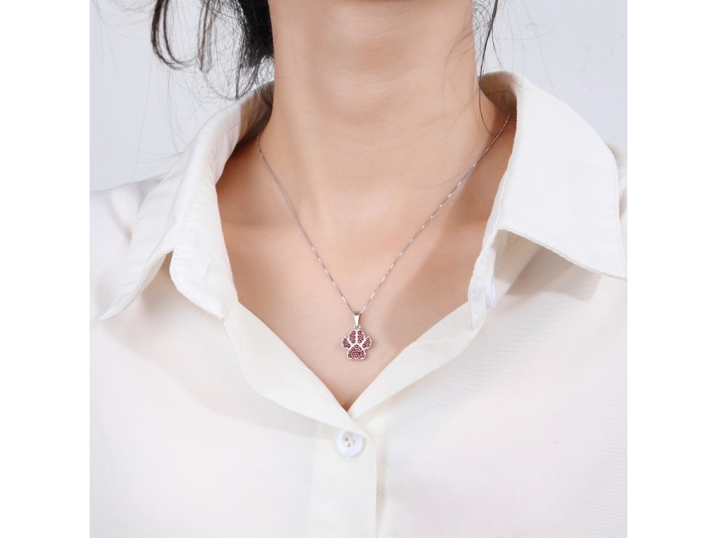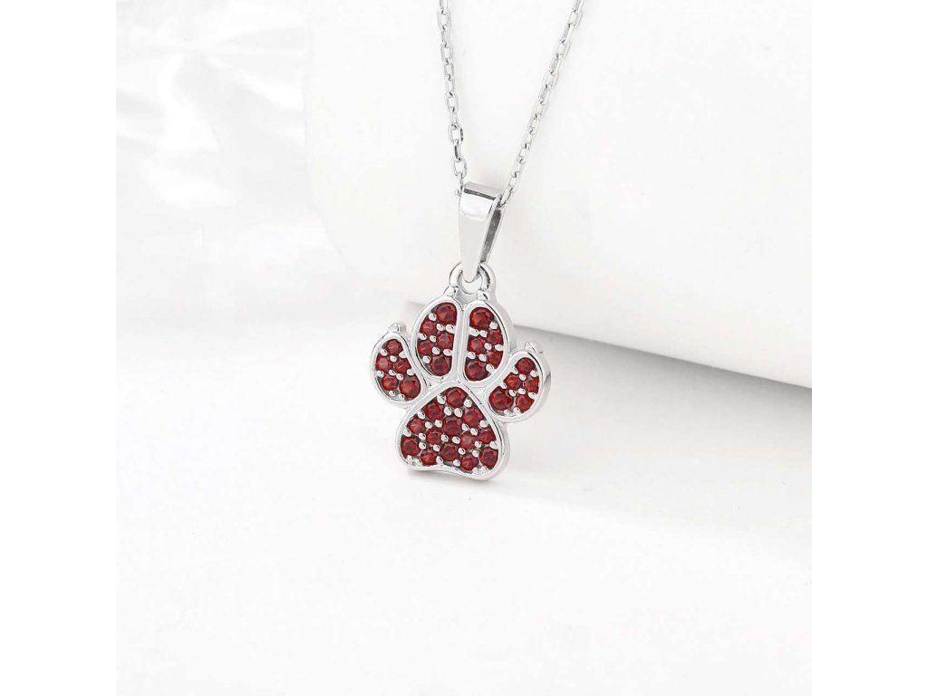Stříbrný přívěsek s Českým granátem (925/1000). Roztomilý přívěsek ve tvaru psí tlapky, který je vykládaný drobnými českým granáty. Pravost kamenů je doložena certifikátem o původu. Stříbro je povrchově upraveno rhodiováním, které se postará o dlouhodobý lesk a ochranu před oxidací šperku. Všechno naše zboží je označeno puncovními značkami uznanými Puncovním úřadem ČR.Doplňkové parametry