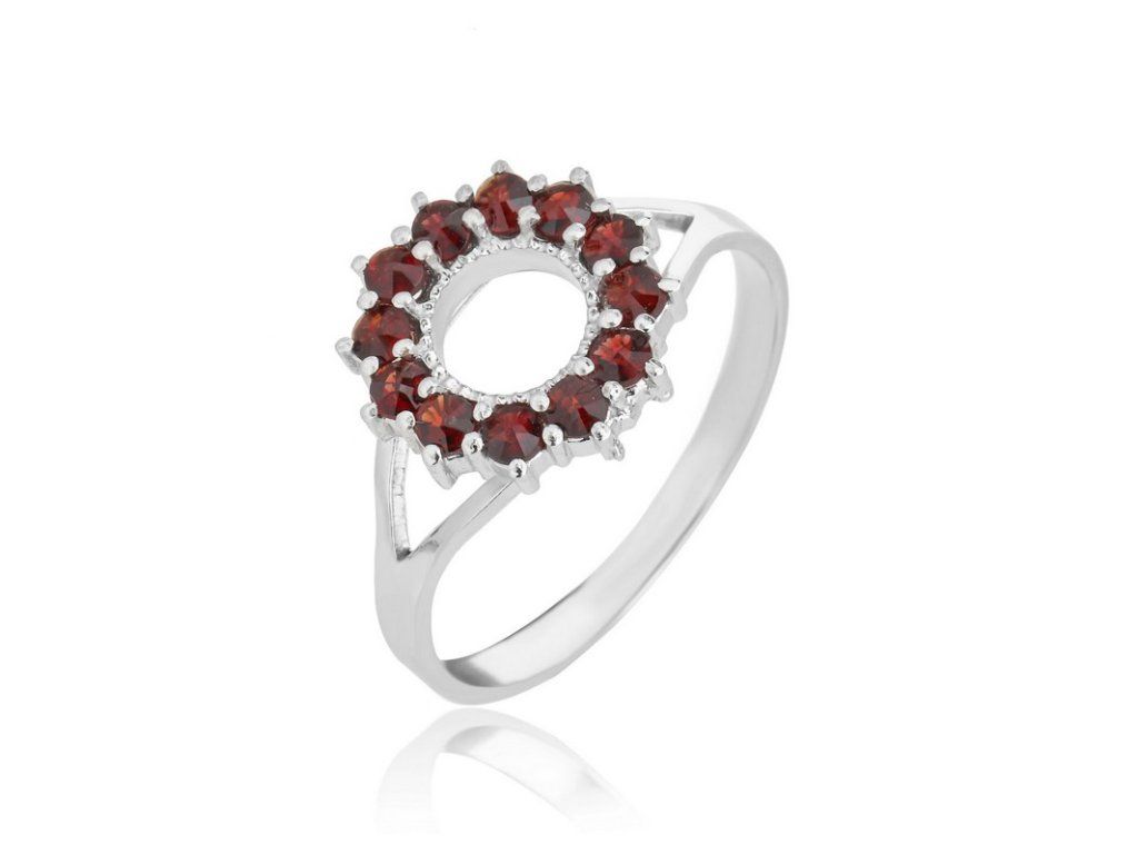 Dámský prsten ze stříbra (925/1000). Ozdoba je kulatého tvaru, která je po obvodu osazená Českými granáty. Ke šperku obdržíte certifikát o pravosti kamene. Šperk je chráněn povrchovou úpravou rhodiováním, které jej chrání před oxidací. Všechno naše zboží je označeno puncovními značkami uznanými Puncovním úřadem ČR. V parametru: rozměry šperku je uvedena velikost ozdoby prstenu.Doplňkové parametry
