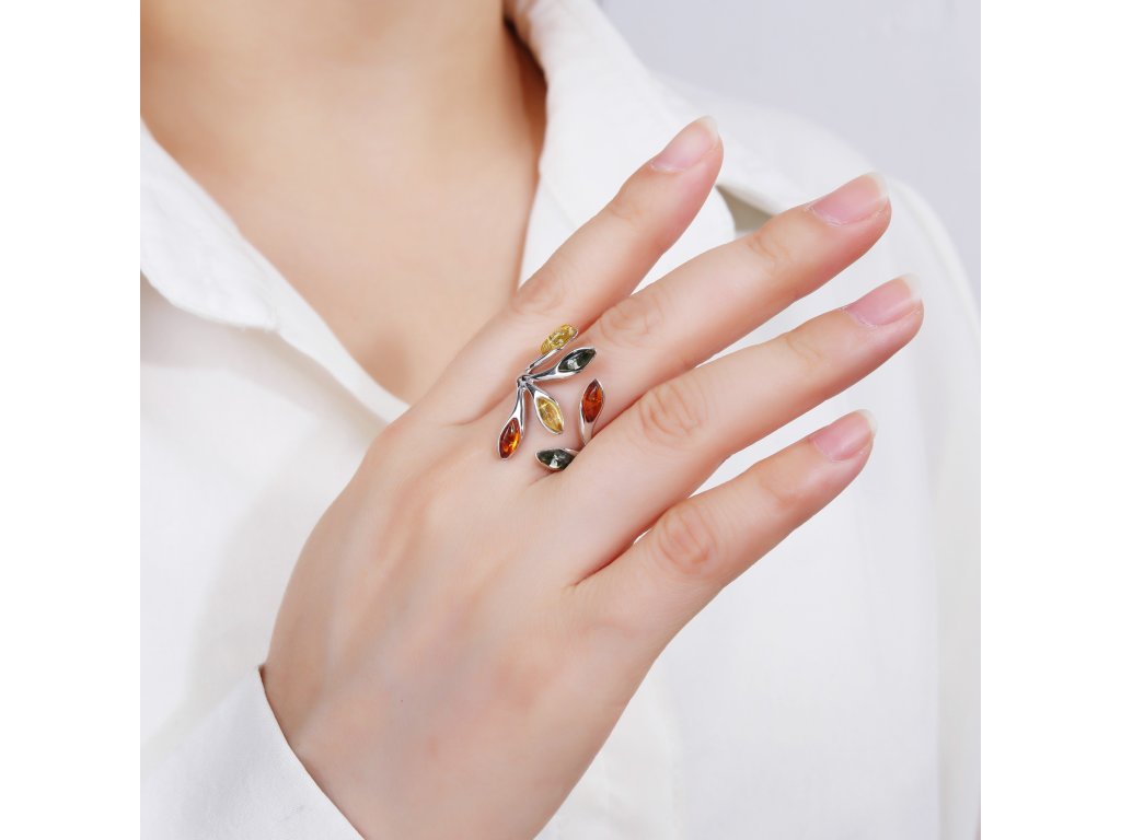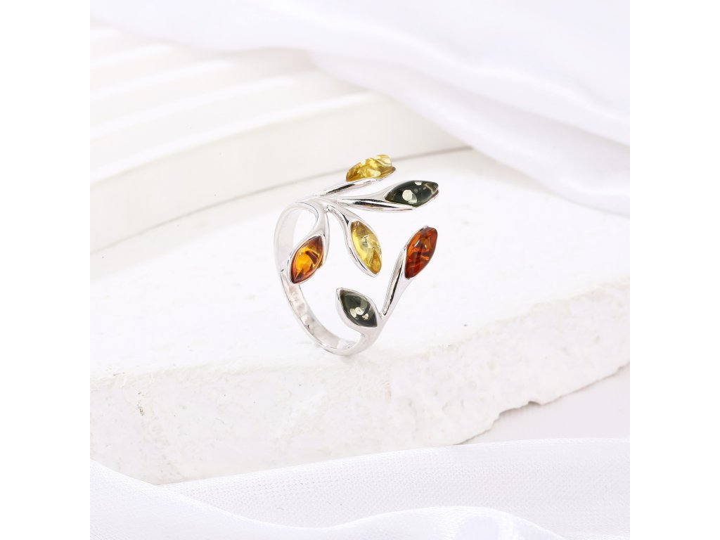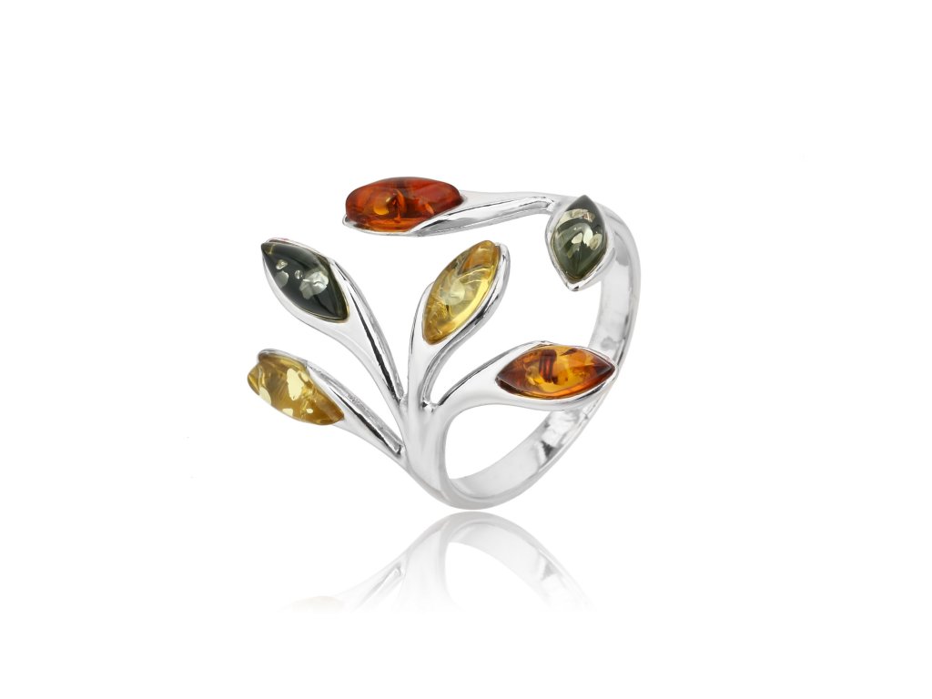 Krásný široký prsten ze stříbra (925/1000) s barevnými jantarovými kameny. Různobarevnost jantarů dávají šperku originalitu. Šperk je chráněn povrchovou úpravou rhodiováním, které jej chrání před oxidací. Všechno naše zboží je značeno puncovními značkami uznanými Puncovním úřadem ČR. V parametru: rozměry šperku je uvedena velikost ozdoby prstenu.Doplňkové parametry