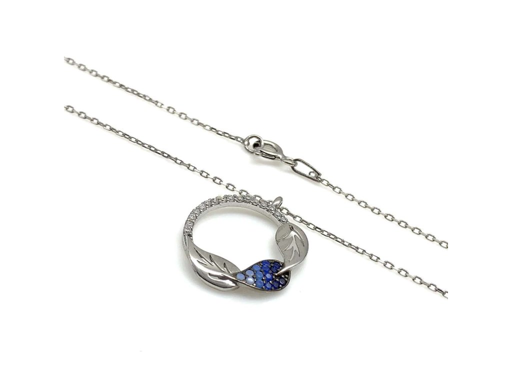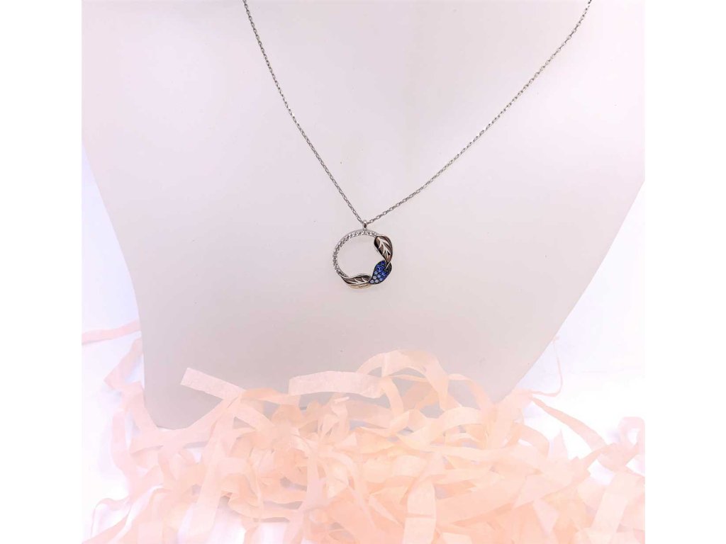 Dámský řetízek s přívěskem ze stříbra (925/1000). Přívěsek má tvar kolečka, které je ozdobené třemi listy. Dva jsou hladké a třetí je vyplněn modrými zirkony. Část kolečka je osázená malými bílými zirkony. Řetízek je typu anker. Stříbro je povrchově upraveno rhodiováním proti oxidaci. Všechno naše zboží je označeno puncovními značkami uznanými Puncovním úřadem ČR.Doplňkové parametry