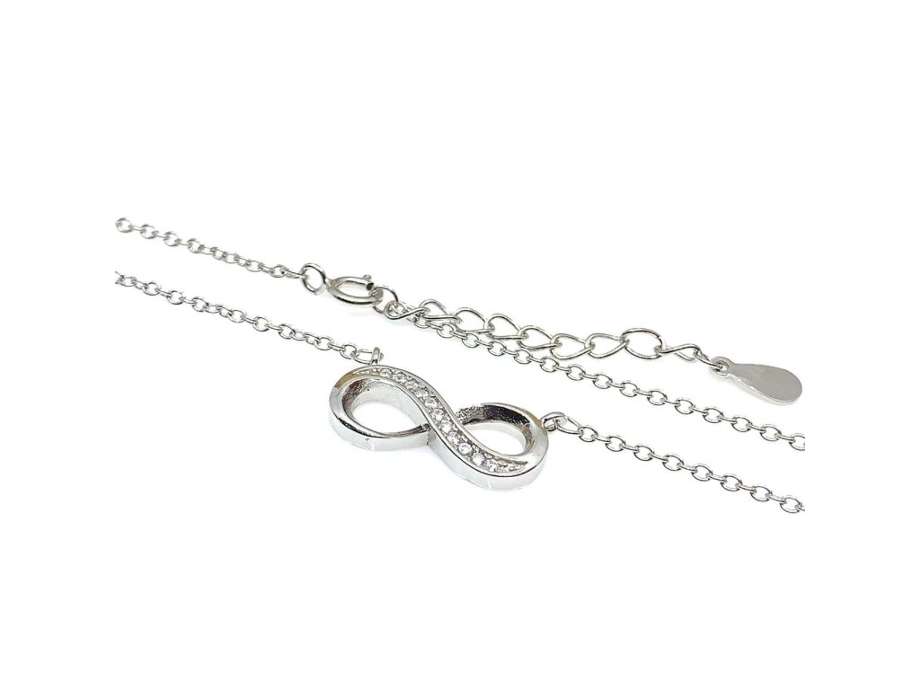 Krásný dámský řetízek s přívěskem ze stříbra (925/1000). Přívěsek má tvar nekonečna, které je z poloviny hladké a z poloviny osázené bílými zirkony. Řetízek je typu anker s nastavitelnou délkou. Šperk je chráněn povrchovou úpravou rhodiováním, které jej chrání před oxidací. Všechno naše zboží je označeno puncovními značkami uznanými Puncovním úřadem ČR.Doplňkové parametry