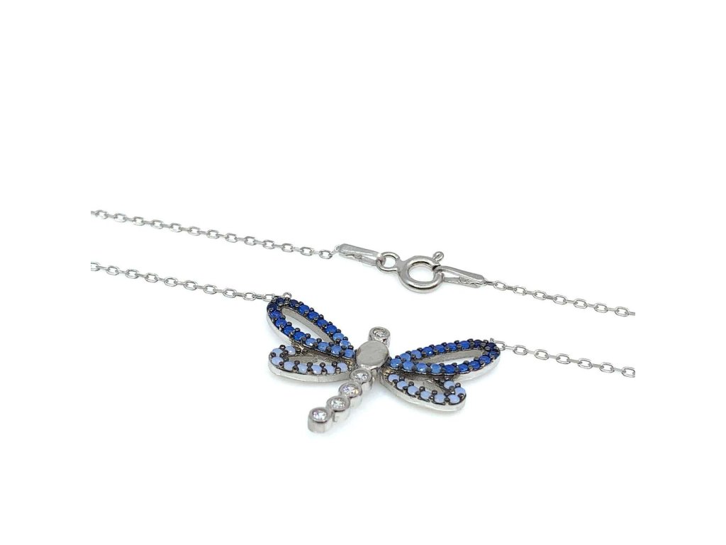 Krásný dámský řetízek s přívěskem ze stříbra (925/1000). Přívěsek má tvar vážky, která je osázená modrými a bílými zirkony. Řetízek je typu anker. Šperk je chráněn povrchovou úpravou rhodiováním, které jej chrání před oxidací. Všechno naše zboží je označeno puncovními značkami uznanými Puncovním úřadem ČR.Doplňkové parametry