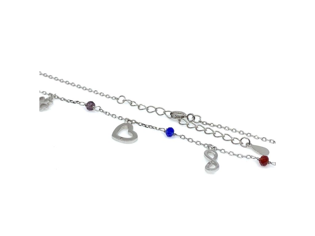 Elegantní dámský řetízek s přívěskem ze stříbra (925/1000). Přívěsek má tvar hladkého srdce, nekonečna a čtyřlístku. Řetízek je vzoru anker s nastavitelnou délkou a ozdoben různě barevnými zirkony ve tvaru kuliček. Šperk je chráněn povrchovou úpravou rhodiováním, které jej chrání před oxidací. Všechno naše zboží je označeno puncovními značkami uznanými Puncovním úřadem ČR.Doplňkové parametry