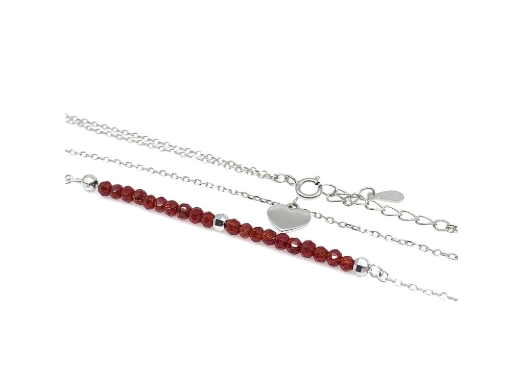 Elegantní dámský dvojitý řetízek s přívěskem ze stříbra (925/1000). Přívěsek má tvar hladkého srdce. Řetízek je vzoru anker s nastavitelnou délkou a ozdoben červenými zirkony ve tvaru kuliček. Šperk je chráněn povrchovou úpravou rhodiováním, které jej chrání před oxidací. Všechno naše zboží je označeno puncovními značkami uznanými Puncovním úřadem ČR.Doplňkové parametry
