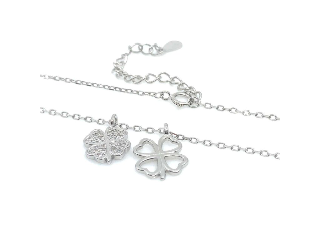 Dámský řetízek s přívěskem ze stříbra (925/1000). Přívěsky mají tvar dvou čtyřlístků. Jeden je pouze obrys a druhý je osázený malými bílými zirkony. Řetízek je typu anker s nastavitelnou délku. Šperk je chráněn povrchovou úpravou rhodiováním, které jej chrání před oxidací. Všechno naše zboží je označeno puncovními značkami uznanými Puncovním úřadem ČR.Doplňkové parametry