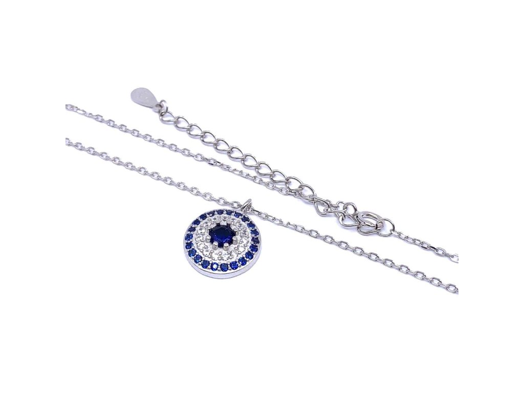 Elegantní dámský řetízek s přívěskem ze stříbra (925/1000). Přívěsek má kulatý tvar. Střed je osázen bílými a tmavě modrými zirkony . Řetízek je vzoru anker s nastavitelnou délkou. Šperk je chráněn povrchovou úpravou rhodiováním, které jej chrání před oxidací. Všechno naše zboží je označeno puncovními značkami uznanými Puncovním úřadem ČR.Doplňkové parametry