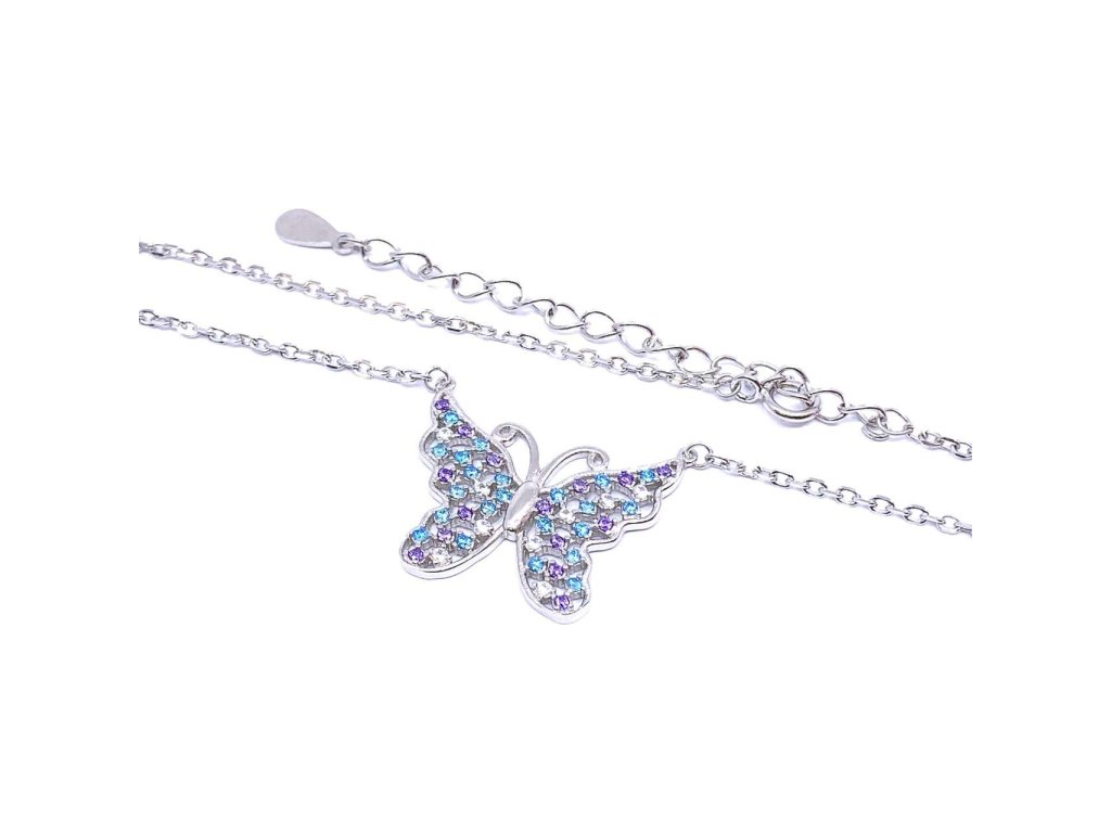 Moderní řetízek s přívěskem ze stříbra (925/1000) ve tvaru motýla, který je nádherně vysázen světle modrými a fialovými kameny. Řetízek je vzoru anker s nastavitelnou délkou. Šperk je chráněn povrchovou úpravou rhodiováním, které jej chrání před oxidací. Všechno naše zboží je označeno puncovními značkami uznanými Puncovním úřadem ČR.Doplňkové parametry