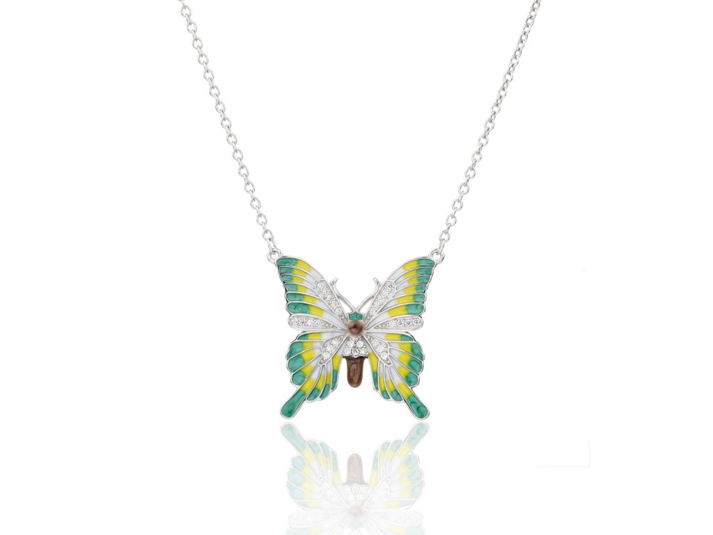 Překrásný dámský řetízek s přívěskem ze stříbra (925/1000) s nastavitelnou délkou 42 až 45 cm bude tím nejlepším dárkem. Přívěsek je ve tvaru motýla zdobený zeleným, žlutým emailem a drobnými bílými zirkony. Šperk je chráněn povrchovou úpravou rhodiováním, které jej chrání před oxidací. Všechno naše zboží je označeno puncovními značkami uznanými Puncovním úřadem ČR.Doplňkové parametry