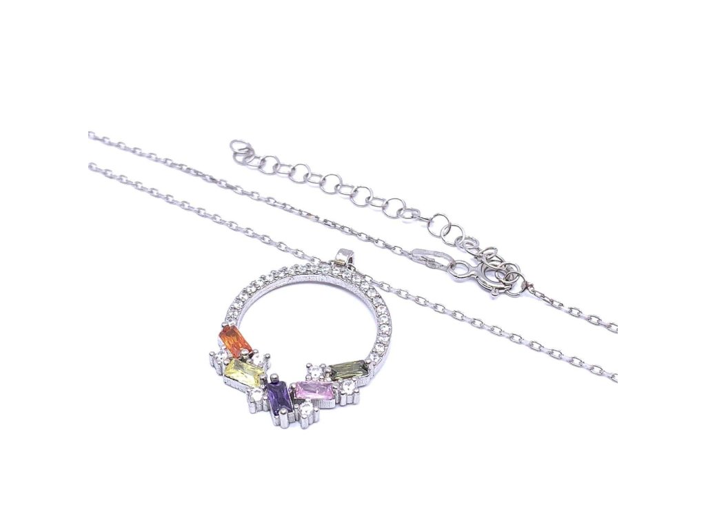 Krásný řetízek s přívěskem ze stříbra (925/1000). Řetízek je typu anker s nastavitelnou délkou. Kulatý přívěsek znázorňuje kolečko, které je zdobené bílými zirkony a v dolní části zirkony barevnými v obdélníkovém tvaru. Povrchová vrstva rhodia chrání před oxidací a zároveň prodlužuje životnost šperku. Všechno naše zboží je označeno puncovními značkami uznanými Puncovním úřadem ČR.Doplňkové parametry