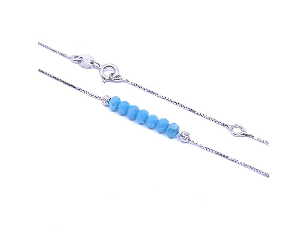 Romantický řetízek s přívěsky ze stříbra (925/1000). Ozdobu tvoří řada modrých korálků tyrkysové barvy. Řetízek typu kostička je s nastavitelnou délkou.Stříbro je povrchově upraveno rhodiováním proti oxidaci. Všechno naše zboží je označeno puncovními značkami uznanými Puncovním úřadem ČR.Doplňkové parametry
