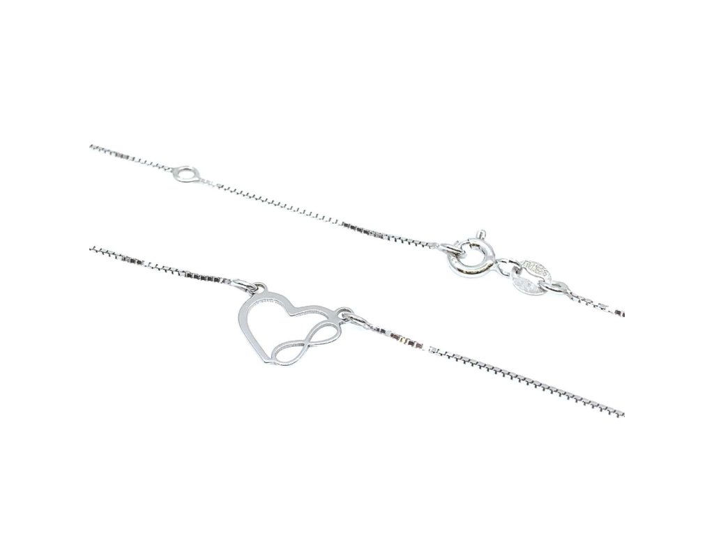 Dámský řetízek s přívěskem ze stříbra (925/1000). Přívěsky jsou ve tvaru srdce a nekonečna spojených k sobě. Řetízek je vzoru kostka s nastavitelnou délkou. Šperk je chráněn povrchovou úpravou rhodiováním, které jej chrání před oxidací. Všechno naše zboží je označeno puncovními značkami uznanými Puncovním úřadem ČR.Doplňkové parametry