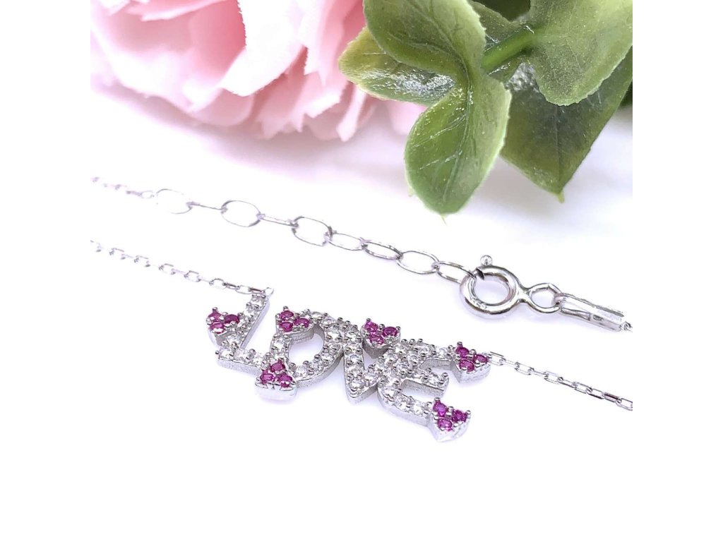 Moderní řetízek s přívěskem (925/1000) s vloženým slovem Love, které je bohatě zdobeno bílými zirkony a srdíčky s červenými kameny. Délka je nastavitelná. Stříbro je povrchově upraveno rhodiováním proti oxidaci. Všechno naše zboží je značeno puncovními značkami, které jsou uznány Puncovním úřadem ČR.Doplňkové parametry