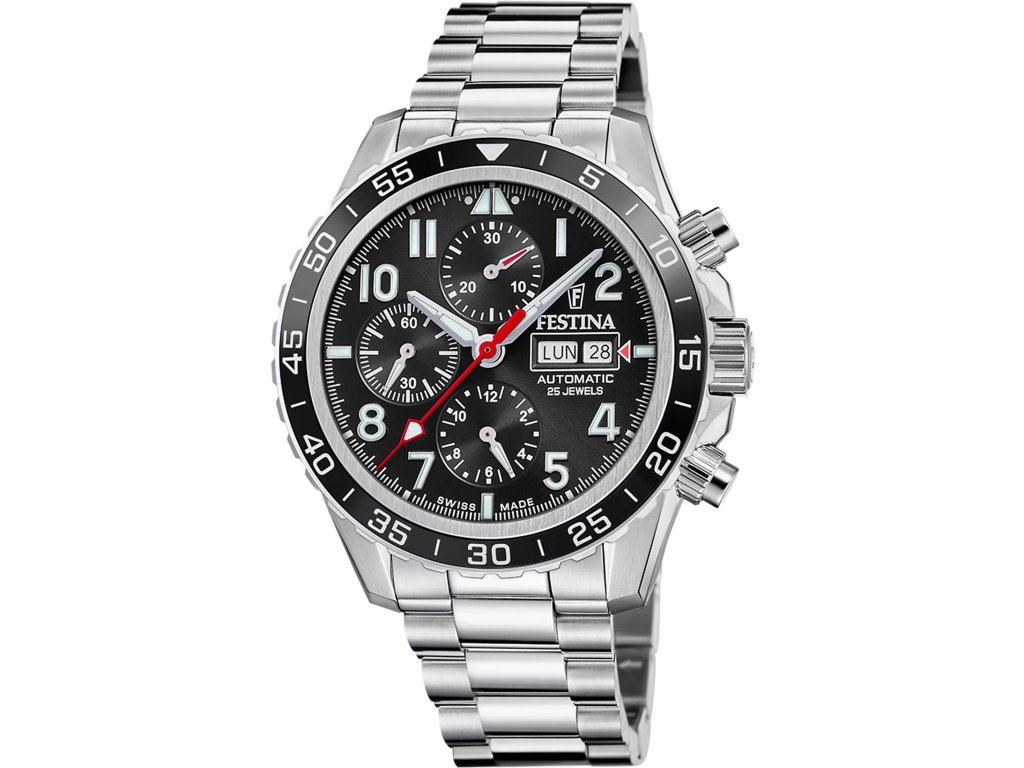 Pánské hodinky Festina z řady Swiss made . Pouzdro i tah jsou vyrobeny z ušlechtilé oceli. Hodinky mají automatický pohon, safírové sklíčko, datum, den v týdnu a šroubovací korunku. Rozměr pouzdra je 45,8 mm. Pásek má rozměr 21,95 mm. Zapínání je motýlkové.Doplňkové parametry