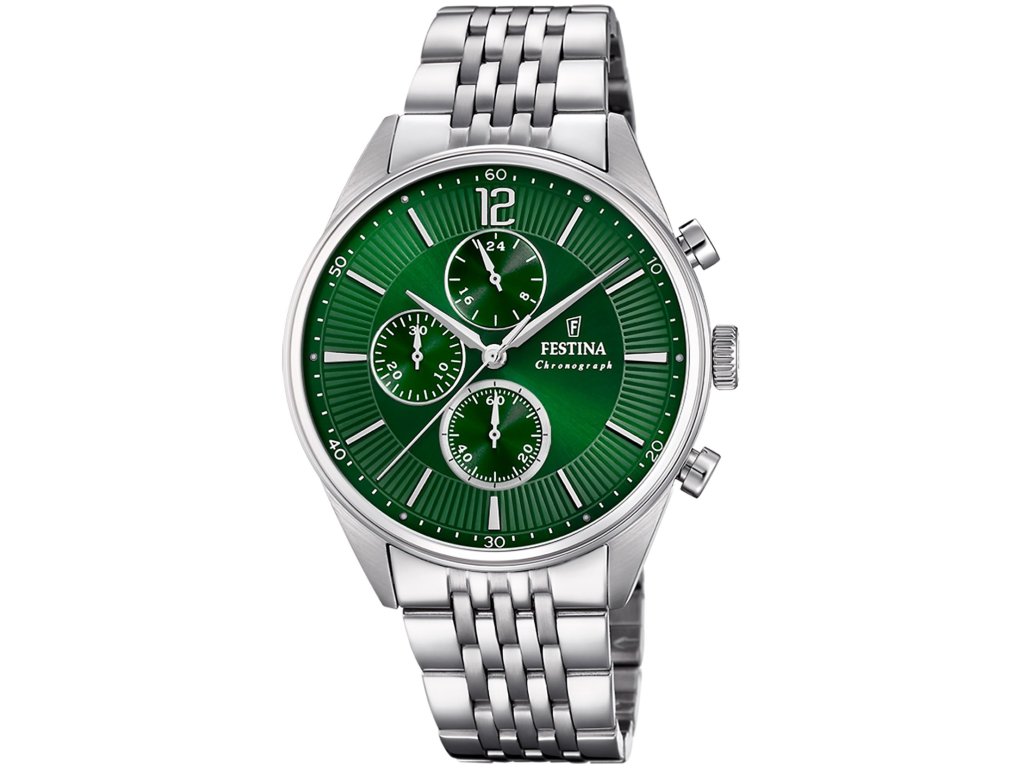 Pánské hodinky Festina z řady Timeless Chronograph . Pouzdro i tah jsou vyrobeny z ušlechtilé oceli. Hodinky mají minerální sklíčko, stopky. Rozměr ciferníku je 36 mm a pouzdro má 41,5 mm. Pásek má rozměr 21,4 mm. Zapínání je na překlápěcí sponu.Doplňkové parametry