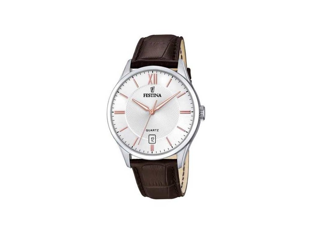 Pánské elegantní hodinky Festina z řady Classic Bracelet. Pouzdro je vyrobené z ušlechtilé oceli. Ciferník má rozměr 37,5 mm a pouzdro 43 mm. Hodinky mají minerální sklíčko, kožený pásek a datum. Číselník má pozlacené číslice do barvy rose gold. Pásek má šířku 22 mm.Doplňkové parametry