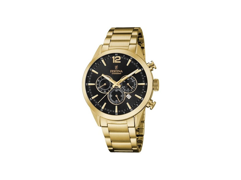 Pánské hodinky Festina z řady Timeless Chronograph. Pouzdro i tah jsou vyrobeny z ušlechtilé oceli. Hodinky mají minerální sklíčko, stopky i datum. Rozměr ciferníku je 37 mm a pouzdro má 43,5 mm. Pásek má šířku 19,9 mm. Zapínání je na překlápěcí sponu.Doplňkové parametry